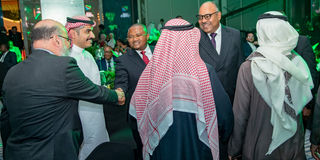 The Minister for Foreign Affairs and East African Cooperation, Ambassador Mahmoud Thabit Kombo (centre), and the Group CEO of the CRDB Bank, Abdulmajid Nsekela, greet some investors and heads of institutions from Dubai and the United Arab Emirates during the official launch of the CRDB Bank Dubai Representative Office, held yesterday at the InterContinental Hotel in Dubai.