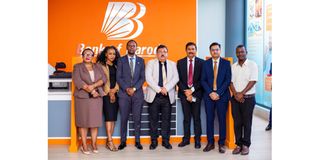The Bank of Baroda Executive Director and the Bank of Baroda (Tanzania) Limited’s Board Chairman Mr Lal Singh (centre), the Bank of Baroda (Tanzania) Limited’s Managing Director Mr Palanivell S K (third right), the Head of Dedicated India Desk International Trade Finance Mr Manoj Kumar Meena (second right), the Upanga Branch Manager Mr Frank Lekule (third left) and other senior staff of the bank in a group photo after the opening of the Upanga branch.