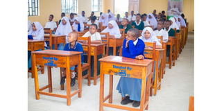 Kibimba Primary School's pupils are seated in desks donated by CRDB Bank as part of the implementation of their Keti Jifunze Programme. The school is located in Kyerwa District, Kagera Region.