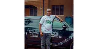 The third prize winner of an IST car, Salum Juma Mdulu from Tabora region, leaning on his car shortly after parking it at his home following the award handover. Mdulu won the prize after performing multiple transactions through SimBanking.