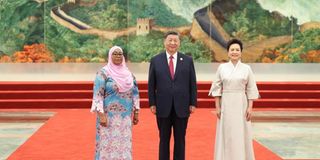 Chinese President Xi Jinping and his wife Peng Liyuan pose for a group photo with Tanzanian President Samia Suluhu Hassan before a welcome banquet held at the Great Hall of the People in Beijing, capital of China, Sept. 4, 2024. Xi and his wife Peng Liyuan hosted the banquet here on Wednesday to welcome the guests attending the 2024 Summit of the Forum on China-Africa Cooperation (FOCAC). Photo Courtesy: Xinhua