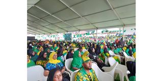 CCM cadres, members and supporters gather at the Mousetoung Grounds in Unguja during a party meeting to be addressed by the Zanzibar presidential candidate, Dr Hussein Ali Mwinyi who on Saturday, August 30, 2025, collected nomination forms from the Zanzibar Electoral Commission (ZEC). PHOTO| LOUIS KOLUMBIA