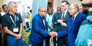 Zanzibar President Hussein Mwinyi (right) greets Exim Bank Tanzania chief executive officer Jaffari Matundu (second left) when Dr Mwinyi visits the bank’s exhibition booth at the second Zanzibar Tourism Stakeholders Summit (Z-Summit) held in Zanzibar on February 21, 2022. Looking on are ZATI chairman Rahim Bhaloo (second right) and Exim Banj officials. PHOTO | The CITIZEN CORRESPONDENT