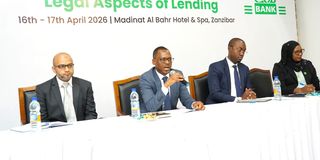 Deputy Attorney General of Zanzibar, Shaaban Ramadhan Abdalla (second left), speaks during the opening of a training session organised by CRDB Bank for government lawyers on legal aspects of loans in Unguja, Zanzibar. PHOTO | COURTESY