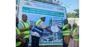Zanzibar’s Minister of Education and Vocational Training, Ms Lela Mohamed Mussa (right), hands over construction documents for Jang’ombe Secondary School to Faster Company representative Mr Fakih Abdalla Pandu. The three-storey school in West Urban District, Zanzibar, is part of a Sh99.187 billion project to build 397 classrooms and will provide 38 classrooms. PHOTO | JESSE MIKOFU